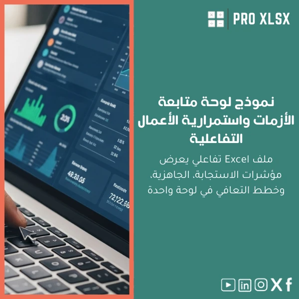 احصل الآن على نموذج لوحة متابعة الأزمات واستمرارية الأعمال التفاعلية وزوّد فريقك بأدوات قياس واضحة لتقليل وقت الاستجابة وخفض آثار الأزمات المالية والتشغيلية. مع ProXlsx تحصل على حل عملي يدعم التنفيذ السريع وخيارات تخصيص احترافية بالساعة.