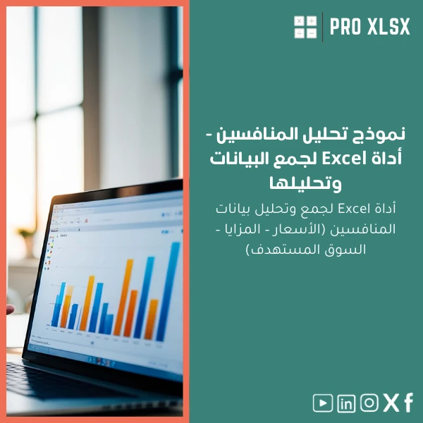 احصل على نموذج تحليل المنافسين بصيغة Excel الآن وابدأ فوراً بجمع ومقارنة أسعار ومزايا المنافسين وإخراج تقارير جاهزة للعرض على الإدارة. يدعم ProXlsx تخصيصاً سريعاً بالساعة إذا رغبت بتسريع التنفيذ.