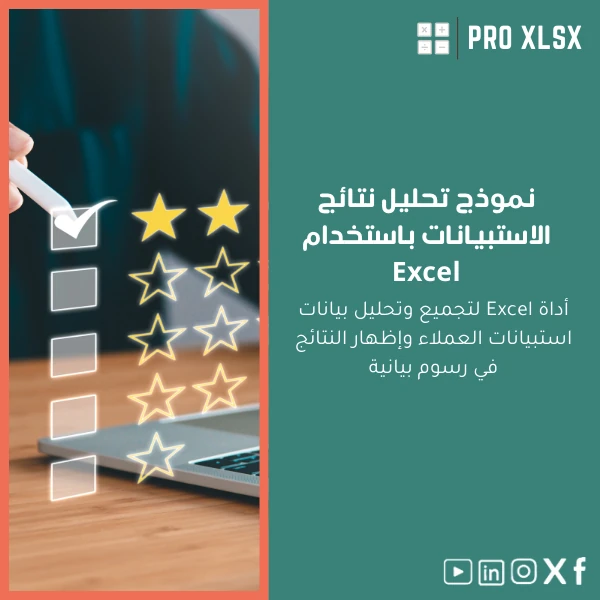 احصل على نموذج تحليل نتائج الاستبيانات واعمل تقارير دقيقة وسريعة تليق بإدارة شركتك أو عملائك. إن رغبت في تخصيص أو أتمتة متقدمة، خدمات ProXlsx متاحة بالساعة.