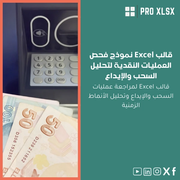 - صيغ متقدمة (Pivot, SUMIFS, INDEX-MATCH, XLOOKUP) ومخططات زمنية لعرض توزيع السحب والإيداع.