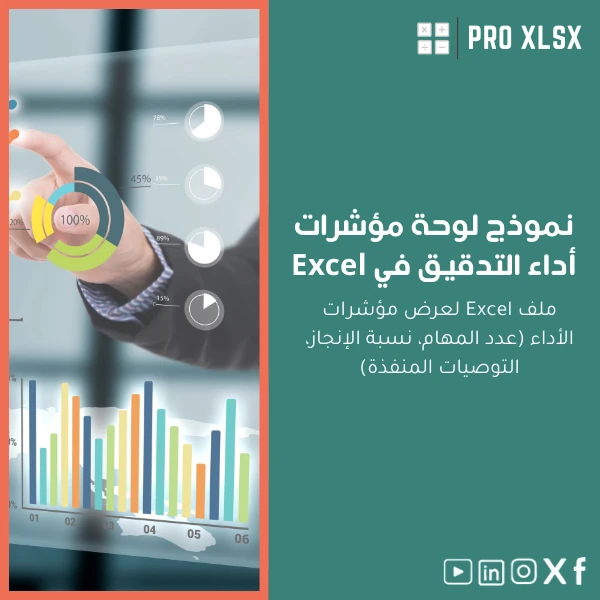 نموذج لوحة مؤشرات أداء التدقيق يوفر لك لوحة مركزية قابلة للتخصيص وتقارير جاهزة لتسليم إدارة أعلى جودة معلومات بأسرع وقت. إذا رغبت بتخصيص النموذج أو طلب تنفيذ سريع لإدخال بياناتك، فريق ProXlsx جاهز لتقديم خدمات بالساعة.