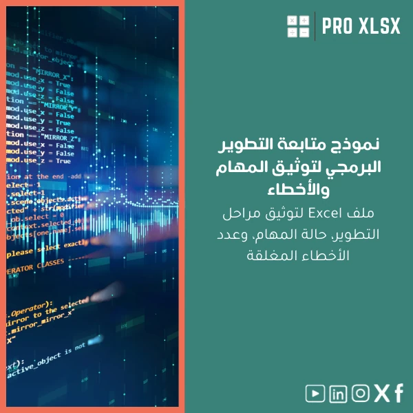 نموذج متابعة التطوير البرمجي بصيغة Excel مصمم لتوثيق مراحل التطوير، حالة المهام، وتتبع عدد الأخطاء المغلقة — حل عملي ومباشر لفرق التطوير والمحاسبين ومحللي البيانات الذين يحتاجون لتقارير دقيقة وقابلة للتحليل دون تعقيد نظم إدارة مشاريع باهظة.